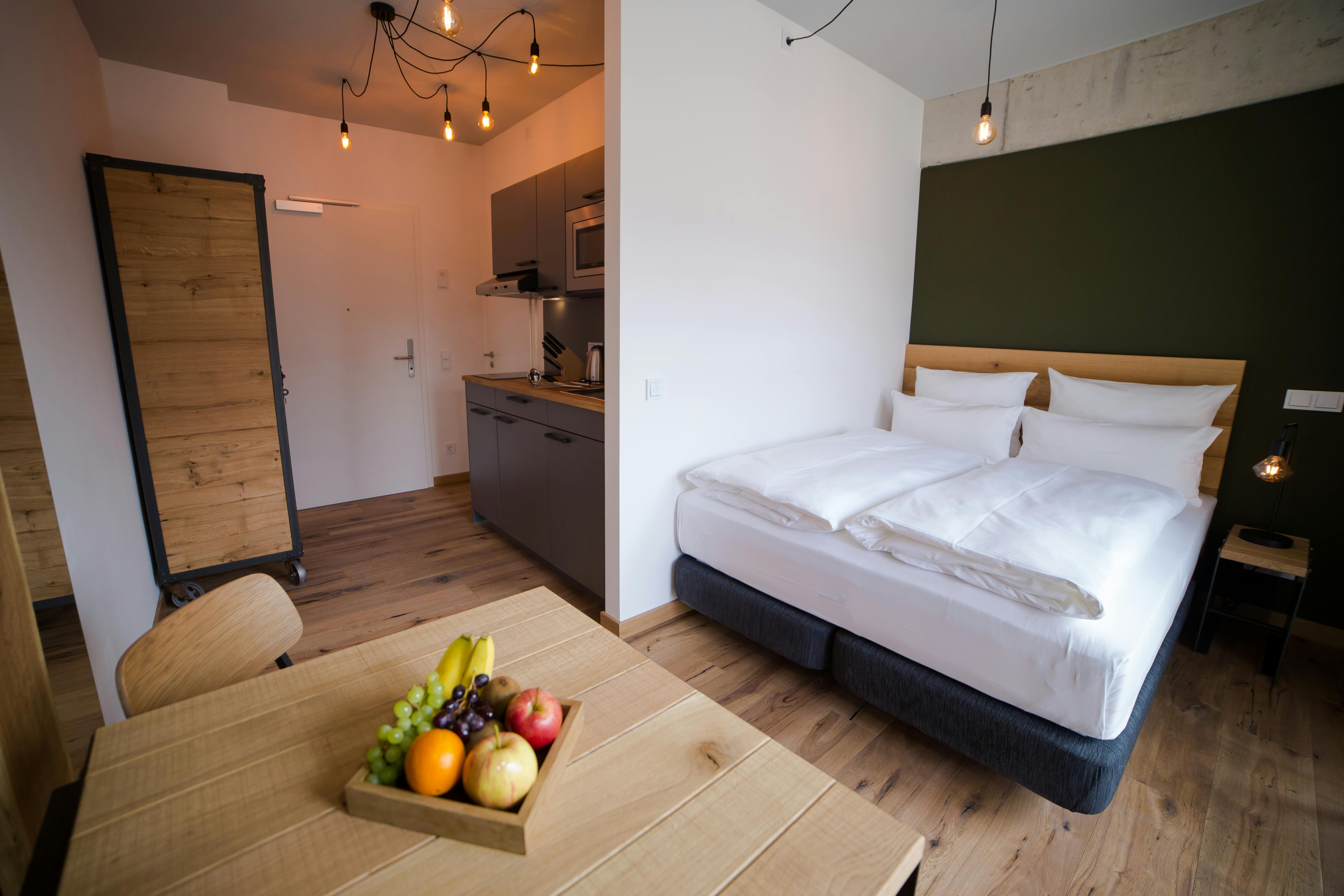 Studio Apartments. Twinrooms have separate beds (ST2), or available with a kingsize bed (S2). For three people a sofa couch is available (S3). Workspace, TV, Iron & Ironing Board, Hypnos Mattress, Wandrobe, Shower, Toiletries, Hair Dryer, Smoke detectors, Travel adaptors available, weekly cleaning, Air conditioning, First aid kit, Carbon monoxide detectors, Room safe, Heating. Fully fitted kitchen including Nespresso machine, microwave, Smeg toaster, Smeg kettle, hob, dishwasher, dishes & utensils, kitchenware (pots & pans), fridge and small freezer. There is a room in the building, where you can find washing machines and dryers, for extra charge.