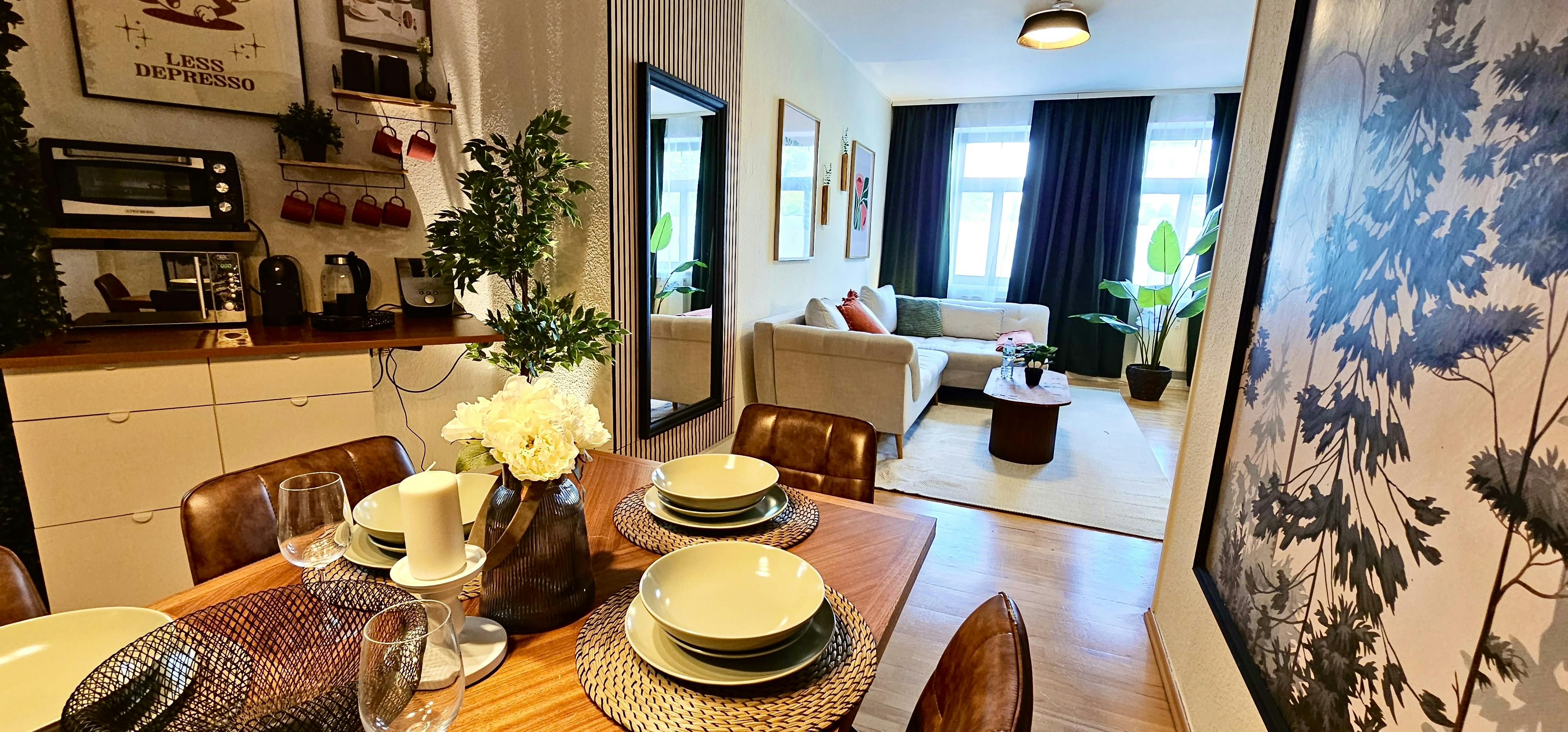 Die möblierte 3-Zimmer-Wohnung befindet sich im Erdgeschoss eines gepflegten Altbaus in Leipzig-Gohlis und bietet auf ca. 80 m2 Platz für bis zu 6 Personen. Sie ist ab dem 1.11. verfügbar. Sie verfügt über zwei Schlafzimmer mit Betten (180x200 cm und 140x200 cm) sowie eine große Schlafcouch im Wohnzimmer. Die Räume sind modern eingerichtet und komplett ausgestattet. Die Küche bietet alle wichtigen Geräte, darunter Geschirrspüler, Kaffeemaschine, Mikrowelle und Heißluftfritteuse. Geschirr, Kochutensilien sowie Kaffee und Tee stehen zur Verfügung. Zur weiteren Ausstattung gehören zwei Smart-TVs mit Streamingdiensten (Netflix, Prime Video, YouTube), Bettwäsche und Handtücher, sowie eine Dartscheibe im Wohnbereich. Im Innenhof befinden sich Sitzmöglichkeiten, die...