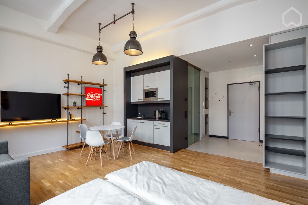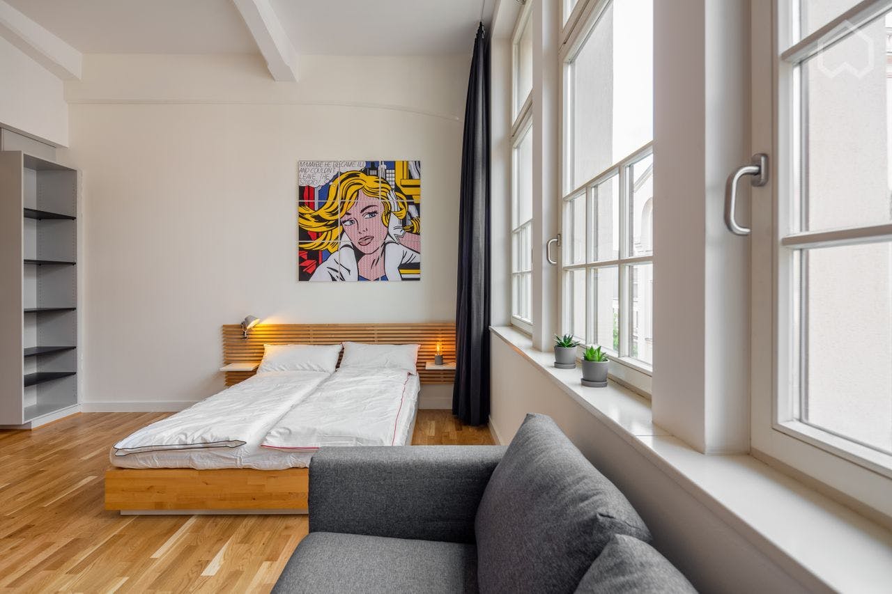 Wohnen im Industrial Loft am alten Bayrischen Bahnhof gegenüber des Uni-Klinikums. Das ehemalige Buchdruckerei-Gebäude wurde zu einem loftähnlichen Wohnhaus umgebaut und dabei sehr modern und hochwertig saniert. Die lichtdurchflutete Wohnung wurde mit hochwertigen Materialien rekonstruiert und mit einem neuen Eichen-Parkettboden ausgestattet. Die Einrichtung wurde liebevoll gestaltet mit einem Mix aus Industrial Elementen und leichtem skandinavischem Design. Der 3,60 m hohe Raum ist durch die drei sehr großen Sprossenfenster lichtdurchflutet und gibt genügend Raum zum Entfalten und Wohlfühlen. Die Küche ist mit Kühlschrank, Mikrowelle und zwei Ceran-Herdplatten gut ausgestattet. Neben Nespresso-Maschine und Wasserkocher finden sich alle wichtigen Utensilien, wie Geschirr, Gläser, Töpfe...
